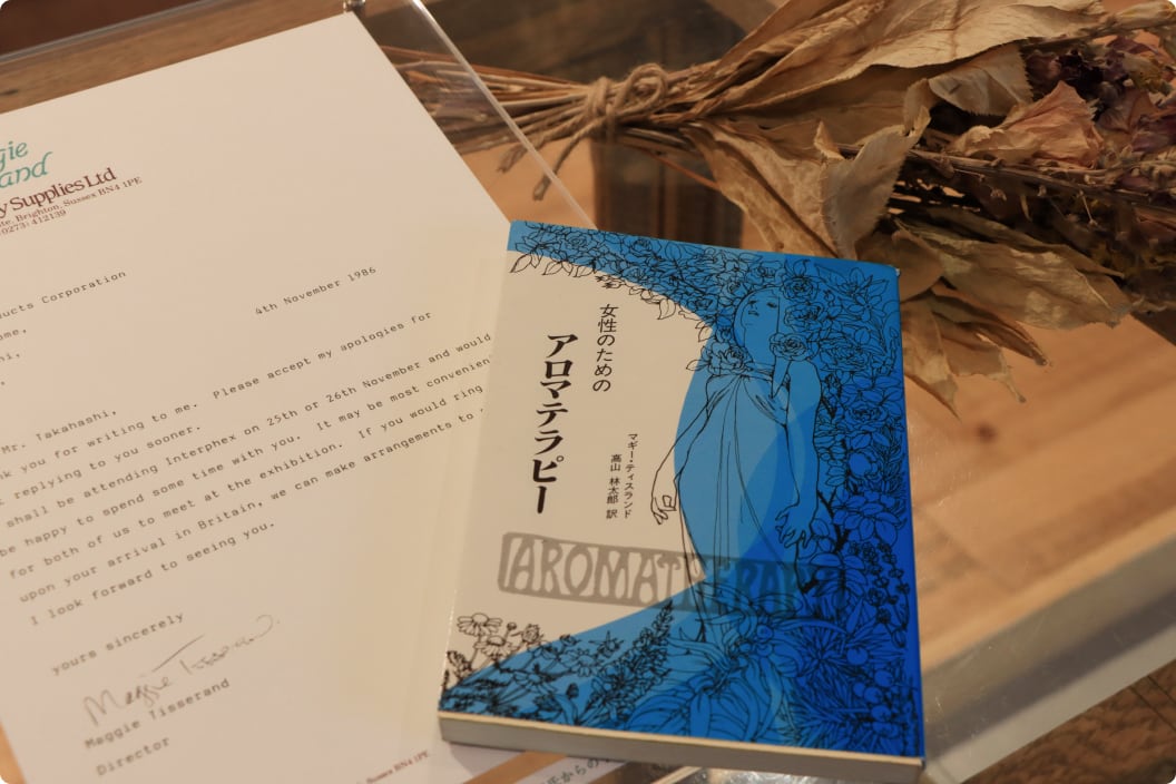 アロマテラピーの先駆者であるマギー ・ティスランド氏に会うため、すぐさまイギリスヘ向かいました。日本での精油の販売を開始、アロマテラピーを紹介しました。